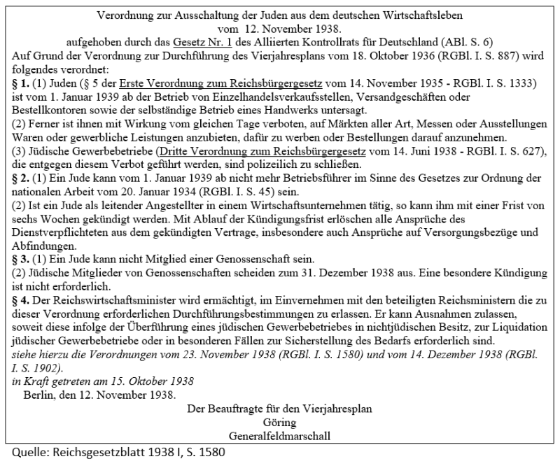 In der nachfolgend abgedruckten „Verordnung zur Ausschaltung der Juden aus dem deutschen Wirtschaftsleben“, die im Jahr 1938 erlassen wurde, heißt es: