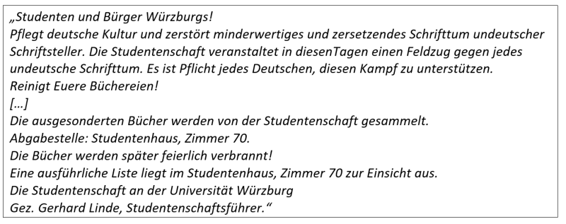 Hintergrund: Das Flugblatt wurde im Zusammenhang mit der Aktion „Wider den undeutschen Geist“ verteilt. Die Aktion veranstaltete zwischen dem 10. Mai und dem 21. Juni 1933 zahlreiche öffentliche Bücherverbrennungen. Es handelte sich um Bücher jüdischer, sozialdemokratischer, kommunistischer oder liberaler Autoren, um kritische Auseinandersetzungen mit dem Ersten Weltkrieg, aber auch um Bücher über Psychologie oder Sexualität.