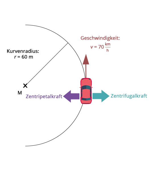 Die Zentrifugalkraft gibt es nur im beschleunigten Bezugssystem, also wenn du dich in dem Objekt befindest, das eine Kreisbewegung ausführt. Sie ist eine Trägheitskraft, die du vielleicht beim Autofahren schon einmal gespürt hast. Wenn das Auto in eine Kurve einfährt, dann widersetzt sich dein Körper zunächst der neuen Fahrtrichtung, denn er hat eine Masse und ist somit träge. Durch die Zentrifugalkraft wirst du etwas seitlich in deinen Sitz gepresst, und zwar in die Richtung, die aus der Kurve herauszeigt. Das ist die Zentrifugalkraft. In diesem Beispiel wird sie also durch Reibung (zwischen dir und deinem Sitz) aufgebracht. Sie ist genauso groß wie die Zentripetalkraft, zeigt aber in die entgegengesetzte Richtung, also nicht zum Mittelpunkt der Kreisbewegung, sondern nach außen.