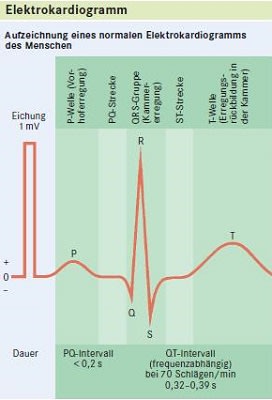 Elektrokardiogramm, Abk. EKG: die Messung und Aufzeichnung der Aktionsströme der Herzmuskelfasern mithilfe von Elektroden an der Körperoberfläche. Das Kurvenbild weist charakteristische Zacken und Wellen auf, die mit den Buchstaben P, Q, R, S, T bezeichnet werden. Die Abstände zwischen ihnen und ihre Form lassen Rückschlüsse auf die Erregungsbildung, die Erregungsleitung und auf den Erregungsrückgang im Herzen und damit auf dessen regelrechte oder gestörte Funktion zu. Dadurch können z. B. Herzrhythmusstörungen und Herzinfarkte erkannt werden.