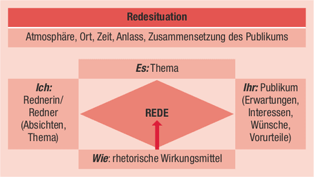Bei der Orientierung an dem Kommunikationsmodell von Karl Bühler (Funktionsbeschreibung des sprachlichen Zeichens) lassen sich folgende Kennzeichnungen einer Rede unterscheiden: