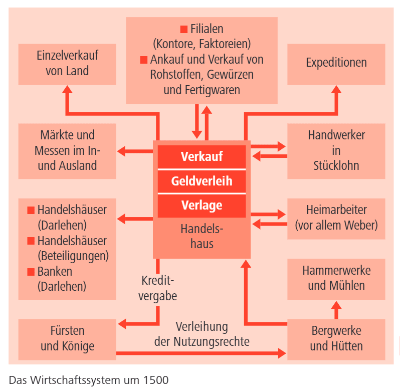 Die ständische Produktionsweise des Mittelalters mit den handwerklichen Zünften, den Gilden und der vom Lehnswesen bestimmten Landwirtschaft wurde nur ansatzweise durchbrochen. Die Landesherren bestimmten etwa mit Marktrechten wirtschaftspolitisch mit. Allerdings gewannen zunehmend Handelshäuser, die sich stark entwickelnde Geldwirtschaft mit Banken, politisch und wirtschaftliche bedeutende Familien wie die Fugger oder die Medici und der sich ausbreitende Fernhandel wachsende Bedeutung und zeigten Merkmale des Kapitalismus. Der sich im Umbruch befindliche Staat initiierte und förderte diese Entwicklung. Die Monopolstellung der großen Handelshäuser und Banken brachten viele Menschen, auch Herrscher, in ihre Abhängigkeit.