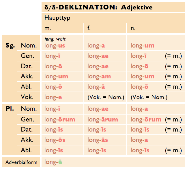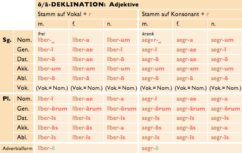 Die maskulinen und neutrischen Formen der Adjektive entsprechen genau denen der Substantive der ō-Deklination. Auch die r-Stämme haben die gleichen Besonderheiten. Die femininen Formen werden genau wie die Substantive der ā-Deklination dekliniert.