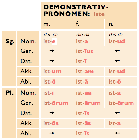 • Der Nom.Sg. des Maskulins und Neutrums enden auf -e bzw. -ud. Dabei gehört -ud zu den typischen Pronominalendungen des Nom./Akk.Sg.n. mit Auslaut d (vergleiche ill-ud, qu-od, qu-id). Beim Neutrum muss der Akk.Sg. gleich dem Nom.Sg. sein, also ebenfalls istud.