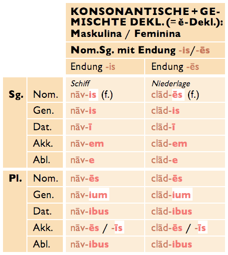 Beispiele für Wörter mit Nom.Sg.-Endung -is oder -ēs findest du vollständig dekliniert in der Tabelle zu (5c)/(5d):