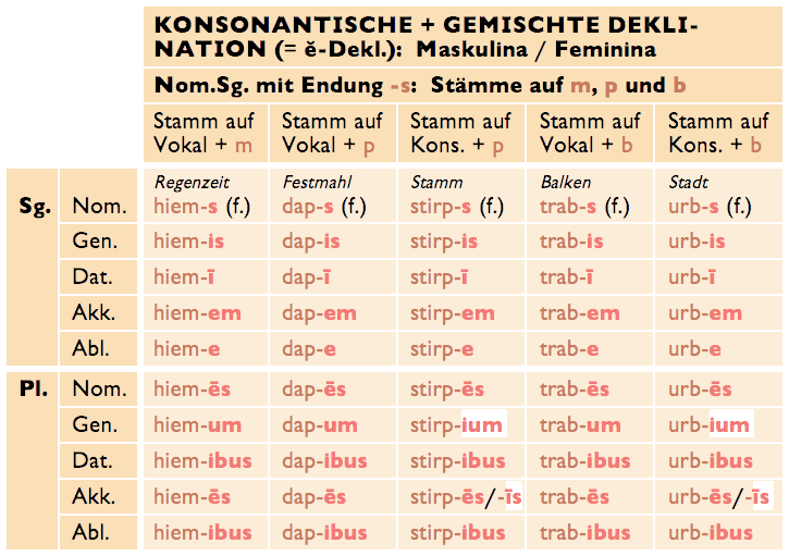 Die Normalendungen kannst du an den Wörtern hiems, daps und trabs in der Tabelle oben ablesen: