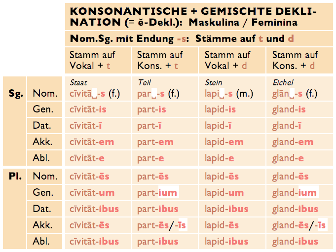 Hinweis: Wir behandeln hier die konsonantische und die gemischte Deklination zusammen, da eine getrennte Darstellung komplizierter wäre und das Verstehen des Systems erschweren würde.
