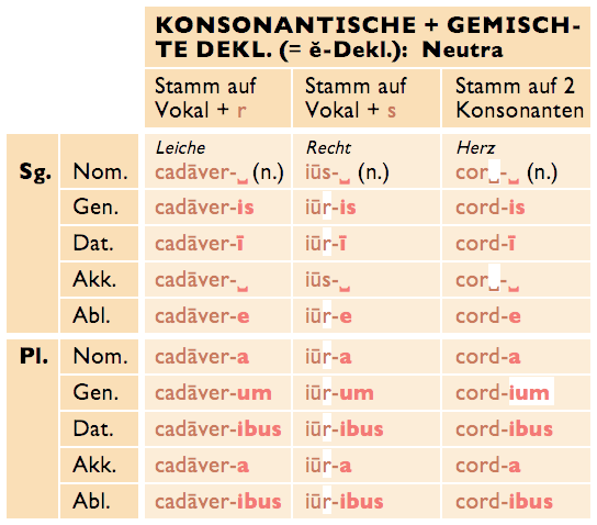 ÷ Neutrum: cadāver-_ n. Leiche, Gen. cadāver-is (siehe Tabelle oben zu (4));