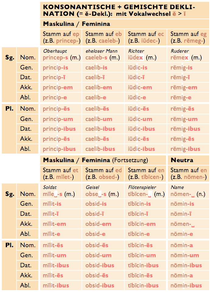 (4) Unter „ĕ-Deklination“ (sprich: „Kurz-E-Deklination“ – im Unterschied zur ē-Deklination, sprich: „Lang-E-Deklination“) verstehen wir die Zusammenfassung von konsonantischer Deklination und gemischter Deklination, also alle Deklinationstypen mit der Endung: