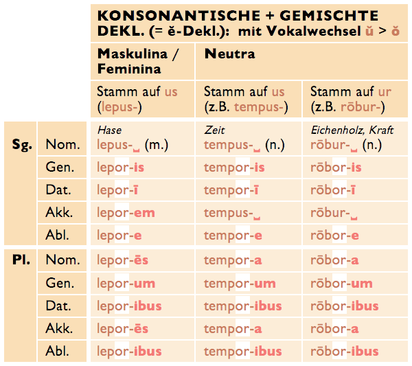 ÷ Maskulin, Einzelwort: lepus-_ m. Hase, Gen. lepor-is, Akk. lepor-em (siehe Tabelle oben);