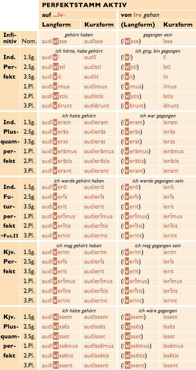 • Bei den Perfektstämmen auf āv, ēv und ōv geht in den Kurzformen vi/ve/vē verloren.