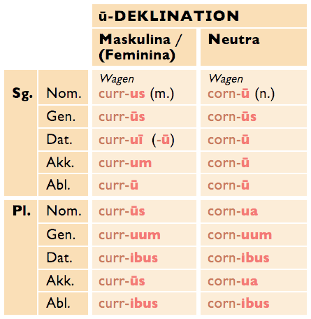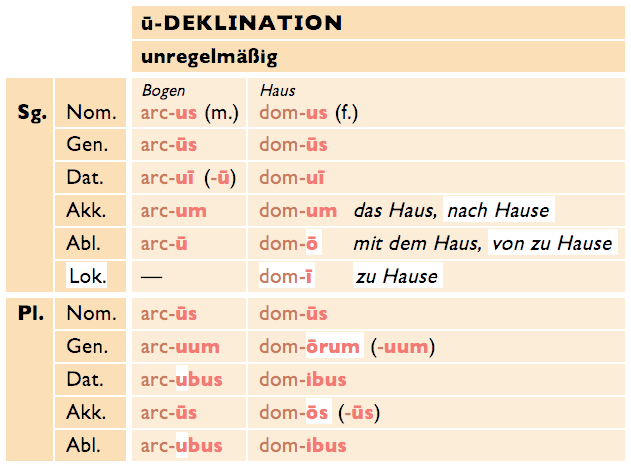 • domus f. Haus (Dekl. siehe unten), manus f. Hand, porticus f. Säulenhalle, tribus f. Tribus (römische Volksabteilung), Īdūs f.Pl. die Iden (Tag in der Monatsmitte);