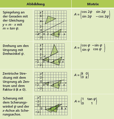 Dabei sind \(\overrightarrow{x} \in X\) der Urbildvektor bzw. -punkt (sozusagen die unabhängige Variable), \(\overrightarrow{x}' \in X'\) der Bildvektor bzw. -punkt (die abhängige Variable) und A die Abbildungsmatrix.