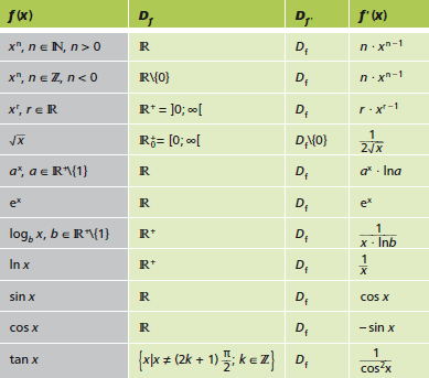 Für das Ableiten (Differenzieren) gelten die Ableitungsregeln, die man sich unbedingt einprägen sollte. Die folgende Tabelle zeigt die Ableitungen wichtiger Grundfunktionen: