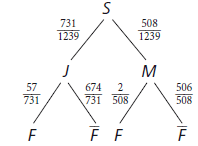 \(P (J \text{ und } F) = \displaystyle\frac{731}{1 239} \cdot \frac{57}{731} \approx 4,6\,\%\)