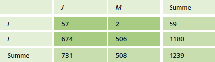 Beim Sehtest in einer Schule werden 1239 Jungen (J) und Mädchen (M) auf Rotgrünschwäche (die sog. „Farbenblindheit“, F) untersucht. Die folgende Vierfeldertafel dokumentiert die gefunden absoluten Häufigkeiten: