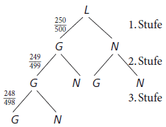 Das nächste Bild zeigt, dass es nicht immer notwendig ist, ein Baumdiagramm vollständig zu beschriften, was recht mühsam werden kann. Gefragt ist hier die Wahrscheinlichketi dafür, aus einer Lostrommel mit 500 Losen nacheinander zwei bzw. drei Gewinne zu ziehen, wenn zu Beginn 250 Gewinne in der Trommel waren und die gezogenen Lose gleich eingelöst, d. h. nicht zurückgelegt werden: