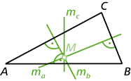 - Die Mittelsenkrechten oder Mittellote sind die Geraden, die senkrecht auf den Seitenmitten stehen. Man bezeichnet sie mit ma, mb und mc. Ihr Schnittpunkt ist der Umkreismittelpunkt M (siehe unten).