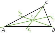 - Die Seitenhalbierenden sa, sb und sc sind Geraden, die jeweils durch eine Seitenmitte und den gegenüberliegenden Eckpunkt verlaufen. Ihr Schnittpunkt ist der Schwerpunkt S.
