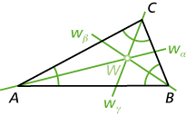- Die Winkelhalbierenden sind Geraden; sie halbieren jeweils einen der Innenwinkel. Man bezeichnet siemit \(w_\alpha\), \(w_\beta\) und \(w_\gamma\). Ihr Schnittpunkt ist der Inkreismittelpunkt W.