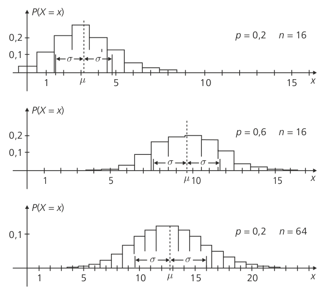 Beispiele für binomialverteilte Zufallsgrößen mit unterschiedlichen Werten für die Parameter p und n: