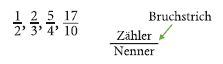 Ein Bruch ist zunächst einfach eine andere Schreibweise für eine Division, denn man kann statt „a : b“ immer auch „\(\dfrac a b\)“ schreiben. Dabei ist a jeweils der Dividend (das, was geteilt wird) und b der Divisor (das, wodurch geteilt wird). Die Zahl über dem Bruchstrich heißt In Bruchschreibweise Zähler, die Zahl unter dem Bruchstrich ist der Nenner. Das Ergebnis der Division (der Quotient oder das Verhältnis) wird dann einfach „Bruch“ genannt.