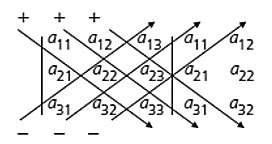 \(\det A =\det \begin{pmatrix} a_{11} & a_{12} & a_{13} \\ a_{21} & a_{22} & a_{23} \\ a_{31} & a_{32} & a_{33} \end{pmatrix} \equiv \begin{vmatrix}a_{11} & a_{12} & a_{13} \\ a_{21} & a_{22} & a_{23} \\ a_{31} & a_{32} & a_{33} \end{vmatrix} \\ \ \\ \quad \quad \ \ = a_{11}a_{22}a_{33} + a_{12}a_{23}a_{31} + a_{13}a_{21}a_{32} - a_{31}a_{22}a_{13} - a_{32}a_{23}a_{11} - a_{33}a_{21}a_{12}\)