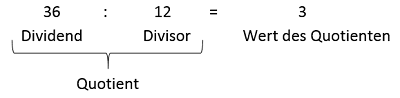 Ein Rechenausdruck, in dem eine Zahl durch eine andere Zahl (oder ein Term durch einen anderen) dividiert wird, ist ein Quotient (manchmal auch „Verhältnis“). Die Zahl links vom Doppelpunkt heißt Dividend (lateinisch: „das zu Teilende“), die rechts davon Divisor (lateiner: „das, was teilt“ bzw. der Teiler). Das Ergebnis einer Division heißt Wert des Quotienten oder auch einfach nur Quotient.