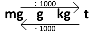 Die Basiseinheit für das Gewicht (oder physikalisch korrekt: die Masse) ist das Kilogramm (kg). 1000 kg nennt man eine Tonne (t), 1000 Tonnen manchmal eine Kilotonne (kt) oder auch 106 kg. Ein Tausendstel Kilogramm ist ein Gramm (g), kleinere Gewichtseinheiten sind Milligramm (mg), Mikrogramm (\(\mu \text g\)) usw. (Einheitenvorsätze).