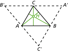 Die drei Höhen ha, hb und hc schneiden sich in einem Punkt, dem Höhenschnittpunkt H. Die Höhen in \(\triangle ABC\) sind gleichzeitig die Mittelsenkrechten (Mittellote) in \(\triangle A'B'C'\), das von den Parallelen zu den Seiten von \(\triangle ABC\) durch die Eckpunkte von \(\triangle ABC\) gebildet wird.