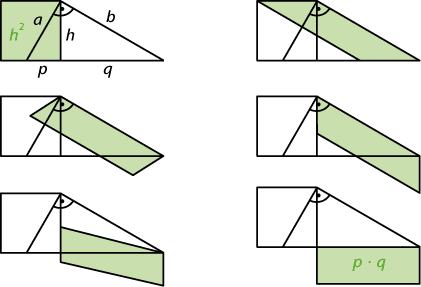 Die Beweisidee illustriert die nachstehende Bilderfolge (man beachte, dass die Fläche eines Parallelogramms gleich bleibt, wenn man eine Seite parallelverschiebt).