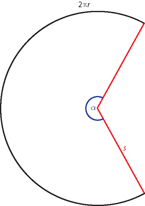 Die Oberfläche setzt sich aus der Grundfläche G und der Mantelfläche M zusammen. Letztere bestimmt man, indem man die Mantefläche in Gedanken „abrollt“. Diese wird dann zu einem Kreissektor mit Radius s und Bogenlänge \(2\pi r\). Die Größe des Winkels \(\alpha\) im Bogenmaß ist \(\displaystyle \alpha = \frac{2\pi r}{s}\) und für die Mantelfläche AM gilt: