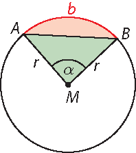 Eine Strecke \(\overline{AB}\), die zwei beliebige Punkte A und B auf der Kreislinie verbindet, aber nicht durch M geht, heißt Sehne. Der Teil der Kreislinie zwischen A und B ist der Kreisbogen \(\widehat{AB}\). Seine Länge b kann man bestimmen, wenn man den Mittelpunktswinkel \(\alpha\) im Bogenmaß angibt: \(\alpha = \displaystyle \frac b r \Rightarrow b = \alpha \cdot r\). Die rote Fläche in der Skizze nennt man ein (Kreis-)Segment, die rote und die grüne Fläche zusammen bilden einen Sektor des Kreises.