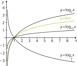 Die Logarithmusfunktionen sind die Umkehrfunktionen der Exponentialfunktionen: \(y = \log_a x \ \ \Leftrightarrow \ \ x = a^y\).