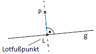 Der Lotfußpunkt ist der Punkt auf einer Geraden g oder Ebene E der den kleinsten Abstand zu einem gegebenen Punkt P hat. Der Name kommt daher, dass man vor allem früher den senkrechten Abstand zu einer Geraden oder Ebene, also die Strecke PL, das „Lot“ genannt hat. Die Aufgabe, ein solches Lot nur mit Zirkel und Lineal zu zeichnen, ist eine der sog. Grundkonstruktionen.