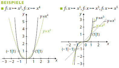 Ihr Funktionsgraph ist eine Parabel n-ter Ordnung, für n = 2 die Normalparabel. Die (maximale) Definitionsmenge ist \(D_f = \mathbb R\), der Wertebereich hängt von n ab: Bei geradem n ist \(W_f = \mathbb R_0^+\), bei ungeradem n ist \(W_f = \mathbb R\).