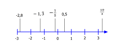Man kann die rationalen Zahlen auf der Zahlengeraden darstellen, allerdings entsprechen nicht alle Punkte auf der Zahlengeraden auch einer rationalen Zahl. Tatsächlich liegen sogar zwischen zwei rationalen Zahlen immer unendlich viele irrationale Zahlen. Erst die reellen Zahlen enthalten alle Punkte auf der Zahlengerade.