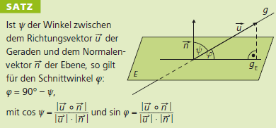Unter dem Schnittwinkel \(\varphi\) zwischen einer Geraden g und einer Ebene E versteht man den nicht stumpfen Winkel zwischen dem Normalenvektor \(\vec n\) der Ebene der senkrechten Projektion gE des Richtungsvektors \(\vec u\) der Geraden auf die Ebene. Dies ist also nicht der Winkel \(\psi\) zwischen \(\vec n\) und \(\vec u\), sondern es gilt \(\varphi = 90^\circ - \psi\) (siehe Abbildung).