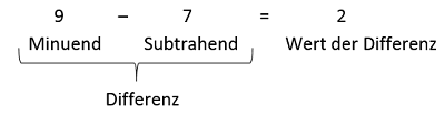 Einen Rechenausdruck mit Minuszeichen, wie „9 – 7“ ezeichnet man als Differenz (lateinisch „Unterschied“). Vor dem Minuszeichen steht der Minuend (lateinisch „das zu Vermindernde“), dahinter der Subtrahend (lateinisch „das Abzuziehende“). Das Ergebnis einer solchen Rechnung heißt Wert der Differenz oder schlicht auch Differenz.