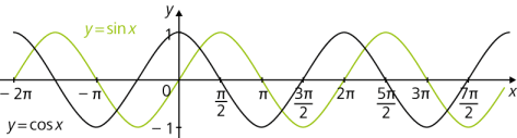 Der Graph der Sinusfunktion (grün) ist punktsymmetrisch zum Urpsrung, der Graph der Kosinusfunktion (schwarz) ist (achsen)symmetrisch zur y-Achse.