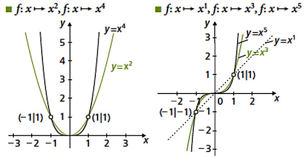 Alle Potenzfunktionen mit geradem Exponent sind (achsen)symmetrisch zur y-Achse, der Graph einer Potenzfunktion mit ungeradem Exponent ist punktsymmetrisch zum Urpsrung.