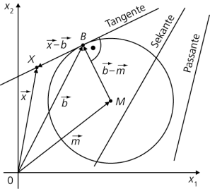 In der Analytischen Geometrie werden Tangenten wie alle Geraden durch Gleichungen angegeben. Für eine Tangente, die einen Kreis k mit Mittelpunkt M(m1|m2) und Radius r im Punkt B(b1|b2) berührt, gibt es die folgenden möglichen Gleichungen: