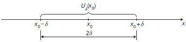 Die „punktierte \(\delta\)-Umgebung“ ist das Intervall ohne den Punkt x0 selbst, also \(U_\delta \setminus \{x_0\}\).