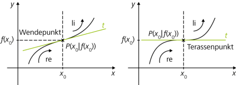Ein Punkt P(x0|f(x0)) des Graphen Gf einer Funktion f heißt Wendepunkt (und die Stelle x0 dann eine Wendestelle), wenn sich dort die Krümmung des Graphen ändert. Die Tangente an diesem Punkt ist die Wendetangente. Ein Wendepunkt mit waagerechter Tangente ist ein Sattelpunkt bzw. Terrassenpunkt.