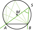 - Ist \(\overline{AB}\) eine Kreissehne und \(S\) ein Punkt auf dem Kreisumfang, dann heißt\(\measuredangle\) \(ASB\) Umfangswinkel.