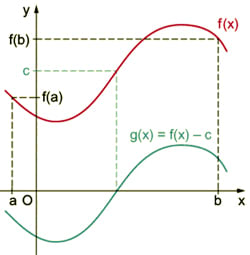 - Wenn eine Funktion f in einem abgeschlossenen Intervall [a; b] stetig ist, dann gibt es für jeden Wert y0 zwischen den Funktionswerten der Intervallgrenzen, f(a) und f(b), mindestens ein \(x_0 \in [a; b]\), dessen Funktionswert genau y0 ist: f(x0) =y0.
