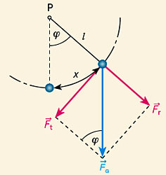 Auf die Pendelmasse wirkt ihre Gewichtskraft \(\vec F_\text G\). Diese lässt sich in einen radialen Anteil \(\vec F_\text r\) und einen transversalen Anteil \(\vec F_\text t\) zerlegen. \(\vec F_\text r\) sorgt dafür, dass der Faden gespannt wird, \(\vec F_\text t\) dafür, dass der Massepunkt zurückgetrieben wird, ist also die Rückstellkraft, da diese Komponente immer der Bewegungsrichtung entgegengerichtet ist, also den Pendelkörper zur Ruhelage hin beschleunigt. Für den Betrag Ft gilt