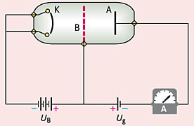 Der Aufbau besteht aus einer Triode, also einer Elektronenröhre, die außer der Auffanganode A und einer beheizbaren Glühkathode K noch eine Beschleunigungselektrode B besitzt, die als Gitter ausgeführt ist (Abb.). Die Röhre ist mit Quecksilberdampf gefüllt. Zwischen K und B liegt eine Beschleunigungsspannung UB an, zwischen B und A eine kleine Gegenspannung \(U_\text g\approx 0,5\,\text V\).