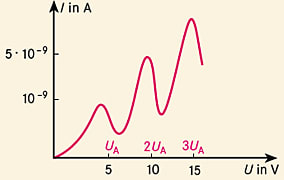 Wenn man UB von 0 langsam von 0 auf einige Volt erhöht, nimmt der Anodenstrom I zunächst stetig zu, bis er bei einer vom Füllgas abhängigen Spannung UA abrupt abnimmt (bei Quecksilber ist UA = 4,9 V). Bei weiterem Anwachsen von UB beobachtet man immer dann, wenn UB ein ganzzahliges Vielfaches von UA beträgt, dass der Anodenstrom plötzlich absinkt (Abb.). Die Erklärung für dieses Absinken liegt in der Anregung von Quecksilberatomen bzw. deren Valenzelektronen aus dem Grundzustand, wofür eine Energie von mindestens 4,9 eV nötig ist. Bei \(U_\text B = n \cdot U_\text A\) können die beschleunigten Elektronen auf dem Weg von K nach B gerade n Hg-Atome in den niedrigsten angeregten Zustand bringen, wonach sie dann nicht mehr genügend Energie haben, um die Gegenspannung Ug zu überwinden.