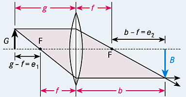 (g: Gegenstandsweite, b: Bildweite). Für die Entfernungen von Gegenstand und Bild vom Brennpunkt, eG und eB, gilt die Gleichung